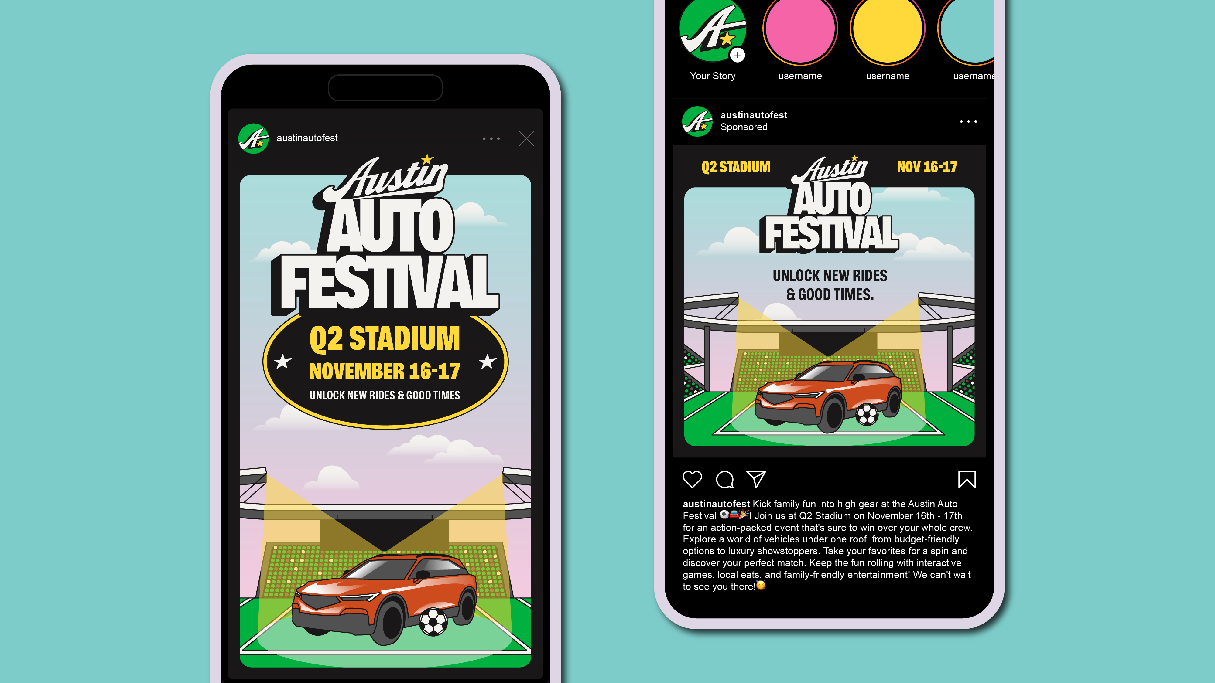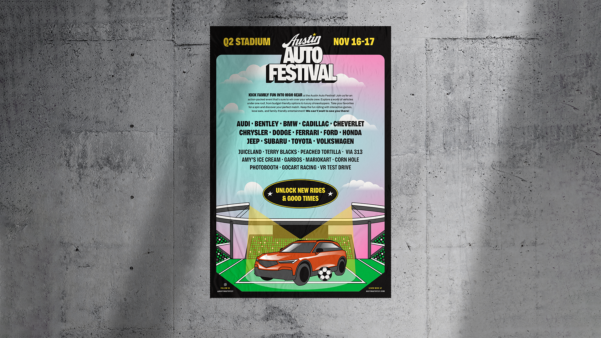 Ex: “Buckle up, folks! The Austin Auto Festival is now at Q2 Stadium. Get ready to zoom, vroom, and zing your way through a day of automotive awesomeness! Psst, rumor has it there might be some celebrity sightings. See you there!”